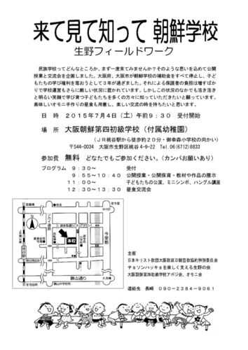 日時:2015年7月4日(土)午前9:30受付開始 会場:大阪朝鮮第四初級学校・同附属幼稚園 大阪市生野区桃谷4-9-22 プログラム: 09:30~ 受付 09:55~10:40 公開授業・公開保育、教材や作品の展示 11:00~ 子どもたちの公演、ミニシンポ、ハングル講座 12:30~…