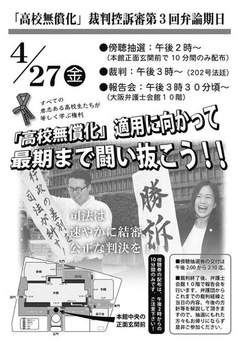 結審の可能性が大です。どうぞ傍聴にお集まり下さい! 日時 2018年4月27日(金)15:00より 場所 大阪高等裁判所 本館2階202号法廷 14:00 本館南側正面玄関前集合 (14:00~14:10 傍聴抽選券配布予定。詳細は、こちら) *終了後は、大阪弁護士会館1001号室+…